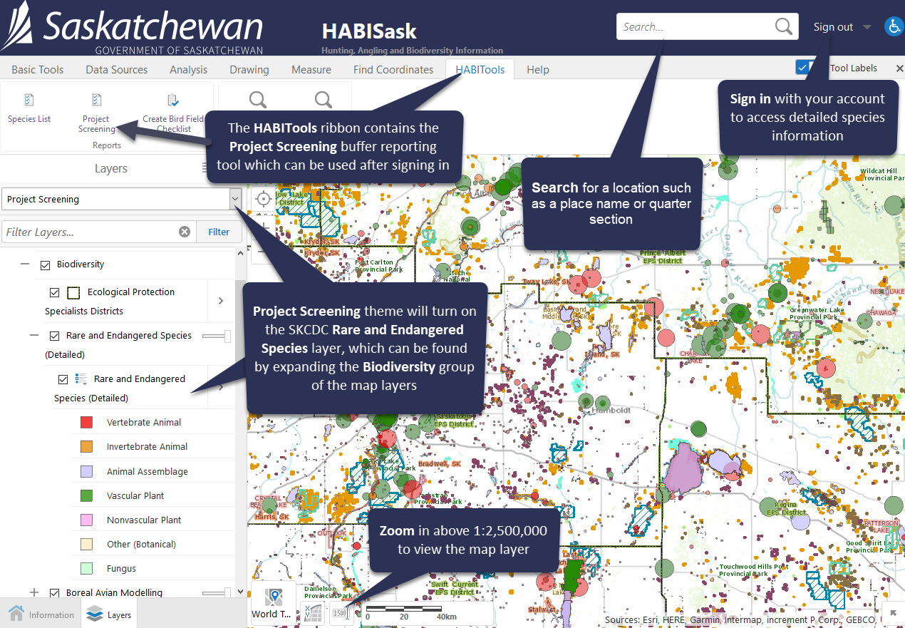 The rare and endangered species map layer is available in HABISask to general users without logging in, but attributes are limited to species group (i.e. animal, vascular plant), and detailed information such as species and observation details are not provided. General users, without a login, are also unable to access the Project Screening Report tool, which enables the creation of a pdf report of biodiversity information within an area. Signing in will also give access to more map layers such as Woodland Caribou, Federal Critical Habitat, Federal Emergency Protection Order, Species Predictive Models, Important Natural Areas and more. Detailed users have read and understand the SKCDC Training Manual and have signed a Data Sharing Agreement with the Saskatchewan Ministry of Environment.